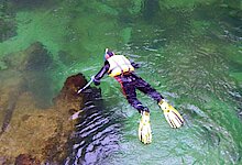 Den Fluss einmal ganz anders sehen. Beim Scuben, der Bezeichnung fürs Schnorcheln in einem Fluss, wirst Du mit den Fischen durch die Unterwasserwelt fliegen. Bestens ausgestattet mit einem warmen Neoprenanzug, Maske, Schnorchel, Flossen und Schwimmweste kannst Du alle Winkel und Ecken des Flusses entdecken, die sonst keiner zu Gesicht bekommt.